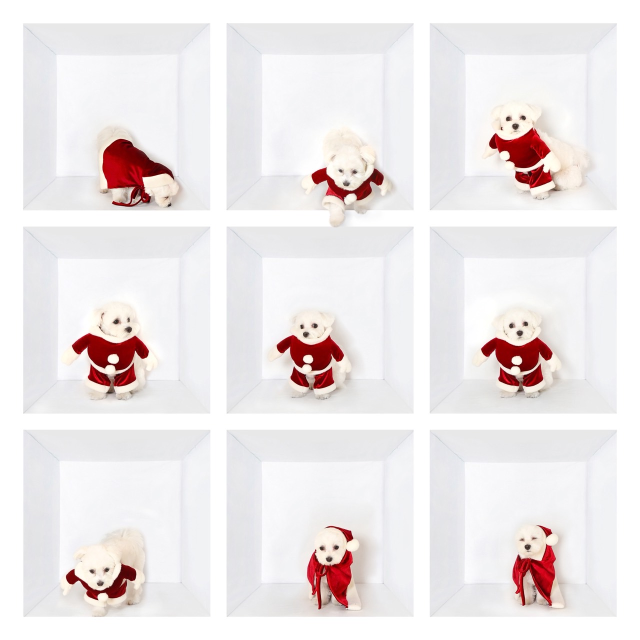 ワンちゃんを箱の中に入れて、コラージュ写真を作ります。